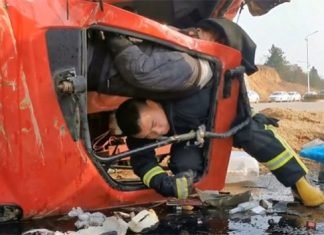 Bombero sostiene por media hora el cuerpo de un camionero atrapado en su cabina...