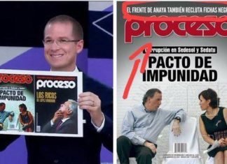 Ciudad de México.- El candidato de la coalición “Por México al Frente”, Ricardo Anaya Cortés, editó una de las portadas de la revista Proceso que exhibió durante el segundo debate presidencial.