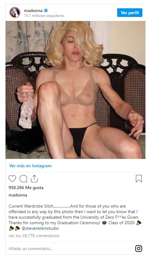 A la expresión de Madonna, que se traduce en algo como “No me importa nada”, continuó: “¡Gracias por venir a mi ceremonia de graduación! Clase 2020”, dicho mensaje fue aplaudido por varios usuarios en los comentarios, en donde apareció el de la cantante Katy Perry, quien manifestó: “¡Dios mío, me acabo de inscribir en esa universidad!”.