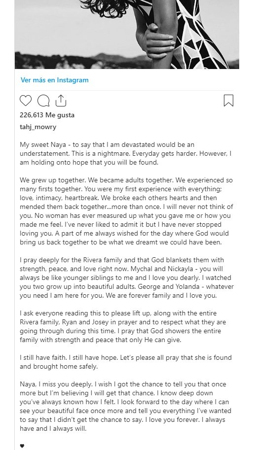 "Mi dulce Naya, decir que estoy devastado sería quedarse corto. Esto es una pesadilla. Cada día se hace más difícil. Sin embargo, me aferro a la esperanza de que te encuentren. Crecimos juntos. Nos convertimos en adultos juntos. Experimentamos muchos primeros momentos juntos”, dijo.