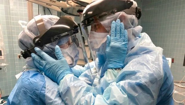 En la imagen, ambos sostienen el rostro del otro y se miran a los ojos a través de su equipo de protección.