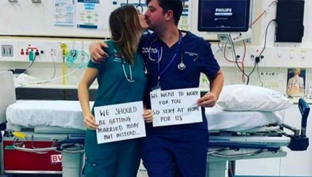"Nosotros deberíamos estar casándonos hoy pero decidimos trabajar para ti. Por favor, quédate en tu casa por nosotros".