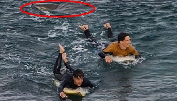 Un vídeo muestra al animal cerca de dos hombres que reman sobre sus tablas.