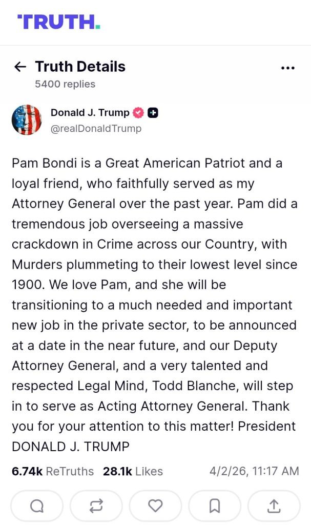 Fuente: El Financiero.- El presidente estadounidense, Donald Trump, anunció este miércoles que ha destituido a la fiscal general de EU, Pam Bondi, a la que ha calificado como “gran patriota” y “amiga leal”, y que su cargo será ocupado de manera interina por el hasta ahora fiscal general adjunto, Todd Blanche.
