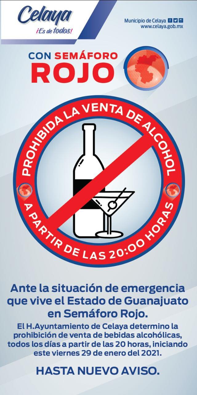 Celaya Gto.- El Ayuntamiento en pleno aprobó el acuerdo que modifica, de manera temporal, los horarios para la venta de bebidas alcohólicas en todos los establecimientos del municipio, derivado de la situación de emergencia sanitaria que se vive en el estado de Guanajuato por la pandemia del COVID-19. En sesión de Ayuntamiento, que se celebró la tarde este viernes, se sometió a votación del pleno el acuerdo que establece un horario limite hasta las 8:00 de la noche para la venta de bebidas alcohólicas en todas sus graduaciones, de lunes a domingo, aplicable a todos los giros exceptuando los depósitos de cerveza en domingo, día en que deberán cerrar a las 5:00 de la tarde, como establece el reglamento vigente. El acuerdo de Ayuntamiento, presentado por la Comisión de Reglamentos, también establece sanciones para los establecimientos que no acaten la disposición, con multas económicas que van de las 150 a las 200 UMAS (Unidad de Medida y Actualización), es decir, desde los 13 mil 443 y hasta los 17 mil 924 pesos. La vigencia de esta disposición es a partir de su aprobación, es decir de este viernes 29 de enero, y por tiempo indeterminado, hasta que el semáforo de reactivación por la contingencia sanitaria derivada del COVID-19, lo permita.