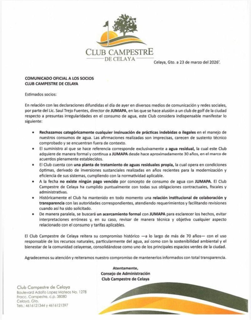 “Cualquier aspecto relacionado con el consumo y tareas aplicadas, El Club Campestre de Celaya reitera su compromiso histórico a lo largo de más de 70 años, con el uso responsable de los recursos naturales, particularmente del agua, así como con la sostenibilidad ambiental y el bienestar de la comunidad de celayense, consolidándose como uno de los principales espacios verdes de la ciudad”.