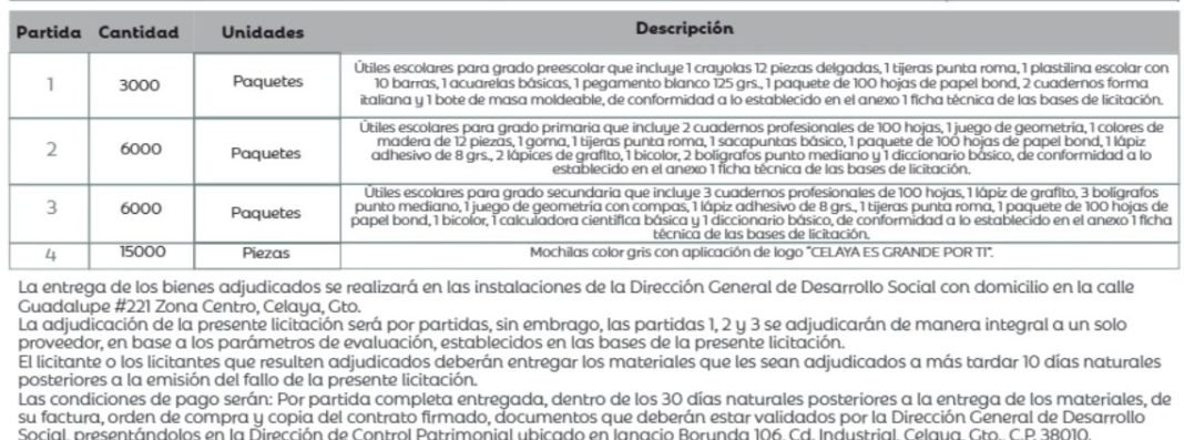 Y para secundaria otros 6 mil paquetes cada uno con 3 cuadernos profesionales de 100 hojas, 1 lápiz de grafito, 3 bolígrafos punto mediano, 1 juego de geometría con compás, 1 lápiz adhesivo de 8 g, 1 tijeras punta roma, un paquete de 100 hojas de papel bond, 1 bicolor, 1 calculadora científica básica y 1 diccionario básico.