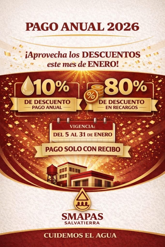 Por su parte, el director del Sistema de Agua Potable y Alcantarillado de Salvatierra (SMAPAS), Mario Alberto Lara López, indicó que continúa vigente la campaña de pago anual, ofreciendo durante enero un 10 por ciento de descuento y en febrero un 5 por ciento, además de un 20 por ciento de reducción para adultos mayores y la posibilidad de realizar convenios con usuarios que presenten adeudos.
