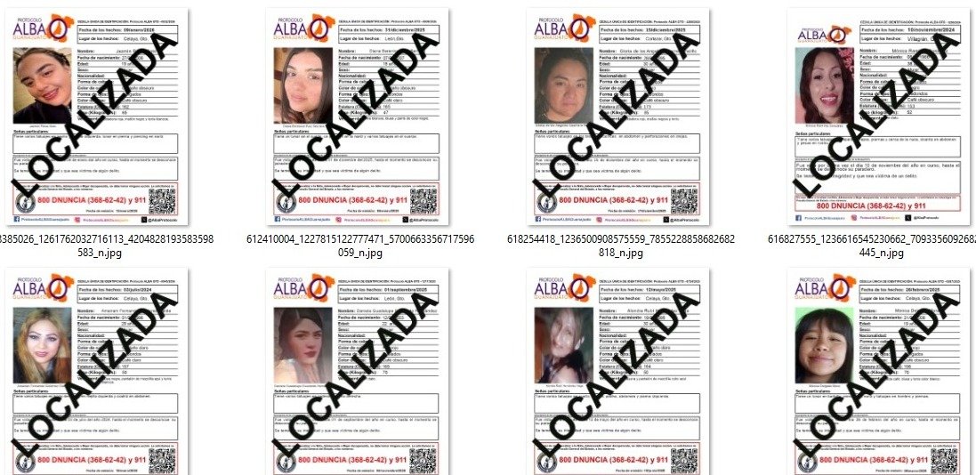 En enero fueron reportadas como localizadas en Guanajuato: Diana Berenice quien desapareció en León el 31 de diciembre de 2025 a la edad de 18 años; Gloria de Los Ángeles de 30 años, desaparecida en Cortazar el 15 de diciembre de 2025 y Mónica de 38 años, desaparecida en Villagrán el 10 de noviembre de 2024.