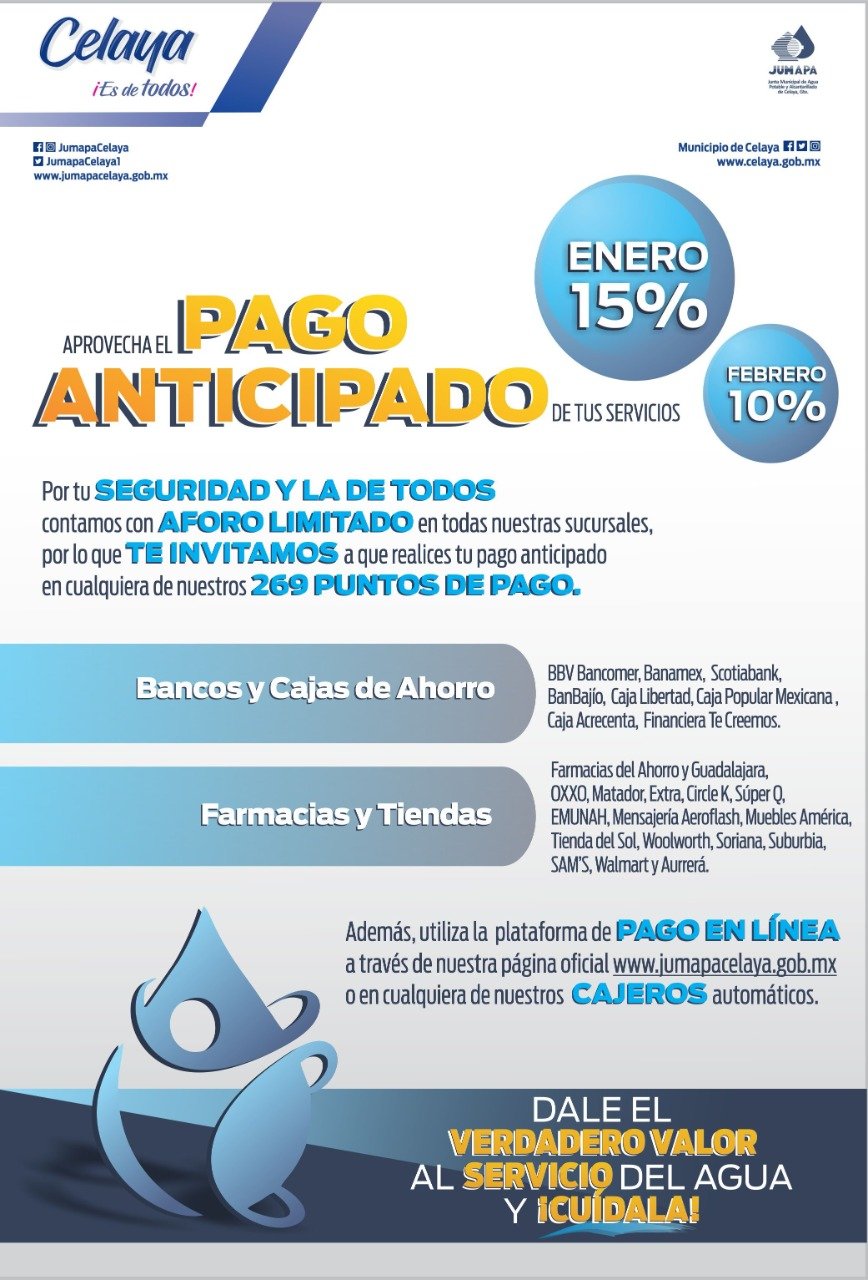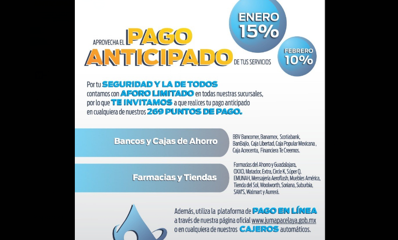 Además, de los pagos en línea a través de la página oficial www.jumapacelaya.gob.mx o en cualquiera de los cajeros automáticos.