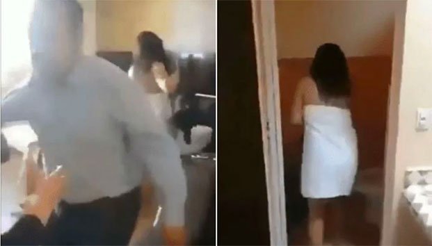 En la grabación se ve al alcalde en aparente estado de ebriedad, mientras que su acompañante camina por la habitación semidesnuda cubierta sólo por una toalla de baño.