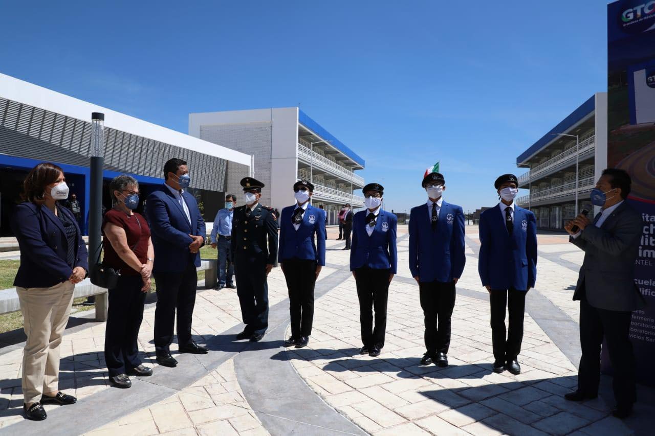 Celaya, Gto.- Para preparar a las presentes y futuras generaciones de técnicos y profesionistas especializados en temas de seguridad, fueron inauguradas las instalaciones de la Preparatoria Bivalente Militarizada de Celaya, que en su primer ciclo recibirá 180 alumnos que ya se encuentran recibiendo clases de manera virtual. La alcaldesa Elvira Paniagua participó en la inauguración de este nuevo espacio educativo, acompañando al gobernador Diego Sinhue Rodríguez, a quien reconoció su compromiso con la educación de la juventud celayense y de la región. “Este es un modelo muy completo que atenderá las necesidades de un programa establecido para las chicas y chicos que estarán estudiando en esta preparatoria, de tal forma que somos afortunados por tener estas instalaciones” La inversión para la edificación de este plantel superó los 62 millones de pesos, por parte del Estado, mientras que el municipio realizó obras complementarias por seis millones de pesos, como son la pavimentación de la calle Ejido de San Nicolás, primera etapa de la pavimentación de la calle Dolores Hidalgo y en este momento se pavimenta la segunda etapa de la calle Dolores Hidalgo. Todo ello, además de la donación del terreno. La presidenta felicitó a estudiantes, padres de familia y docentes por asumir este compromiso que abona al restablecimiento del tejido social. En el evento de inauguración de la Prepa Militarizada también participaron integrantes del Ayuntamiento, funcionarios estatales y municipales, docentes, padres de familia y estudiantes.