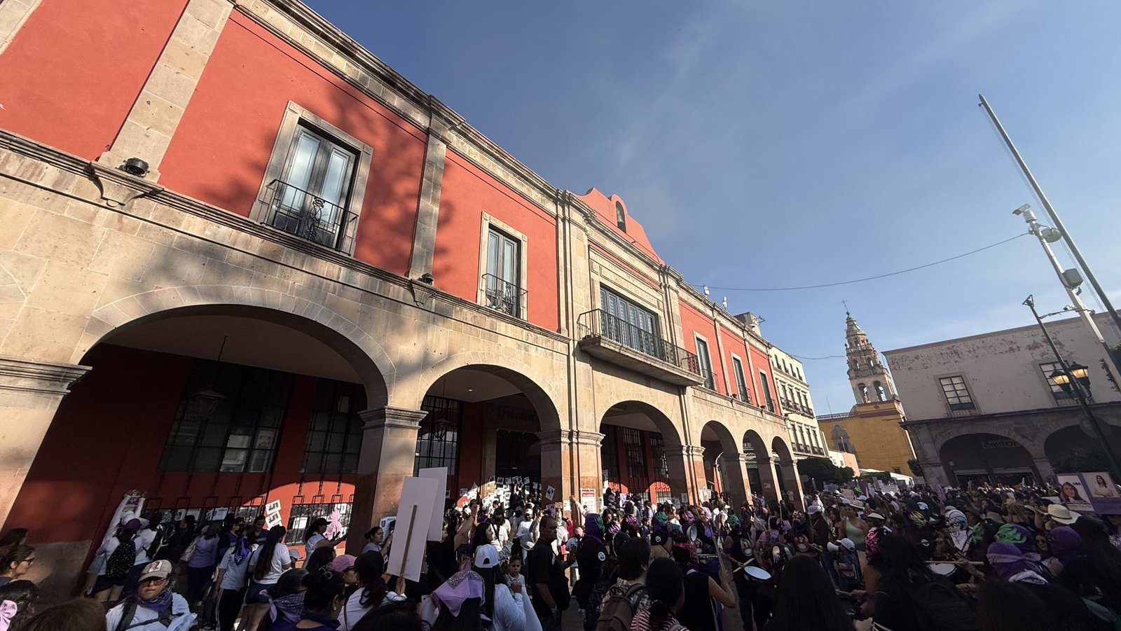 Al llegar a presidencia, algunas mujeres encendieron humos morados y verdes, se hizo un pase de lista y colocaron fotografías de mujeres que han sido víctimas de violencia, abusos, desapariciones y feminicidios.