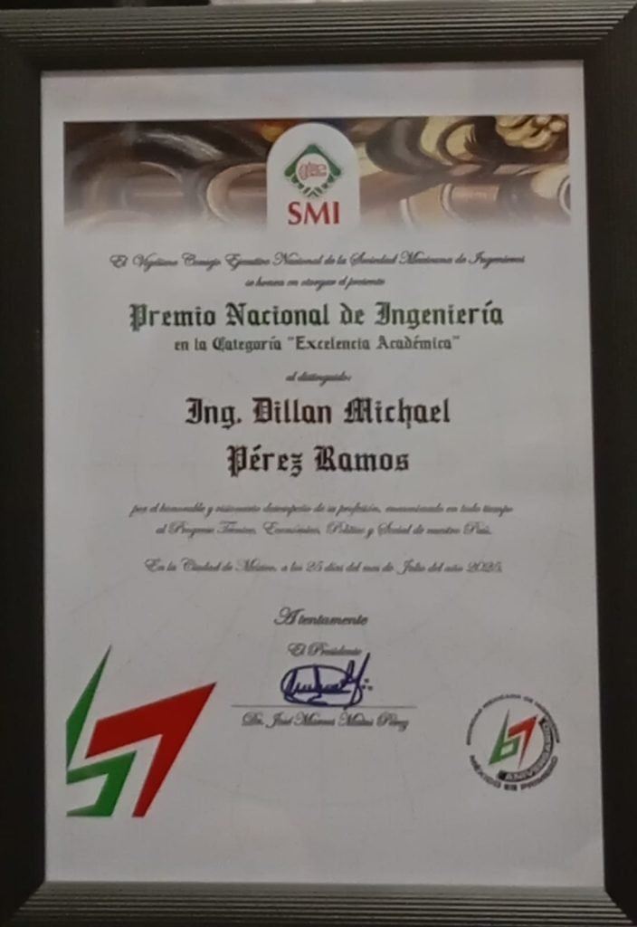 Celaya, Gto., por: Arlett Cárdenas.- El Celayense por adopción Dillan Michael Pérez Ramos, egresado del Instituto Tecnológico de Celaya de la carrera de Ingeniería Ambiental, fue galardonado con el Premio Nacional de Ingeniería 2025 en la categoría de Excelencia Académica.