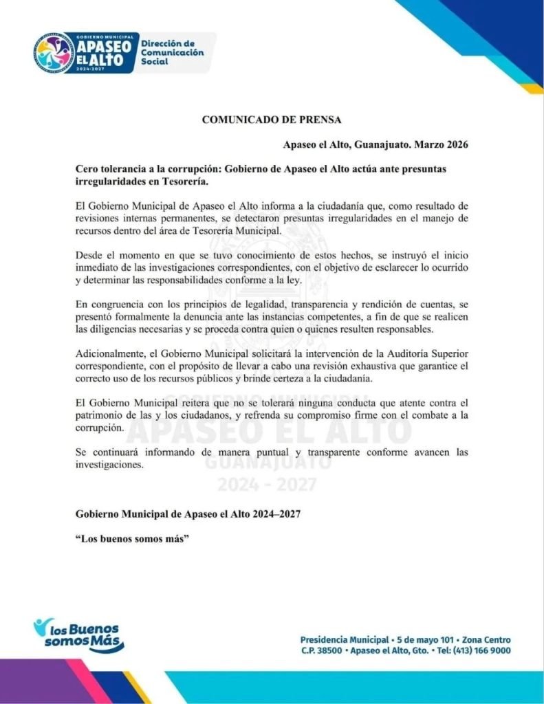 Apaseo el Alto, Gto.- La administración municipal presentó una denuncia ante la Fiscalía General del Estado tras la ausencia del tesorero Jaime Aguirre Mejía, quien dejó de presentarse a laborar desde hace más de una semana.