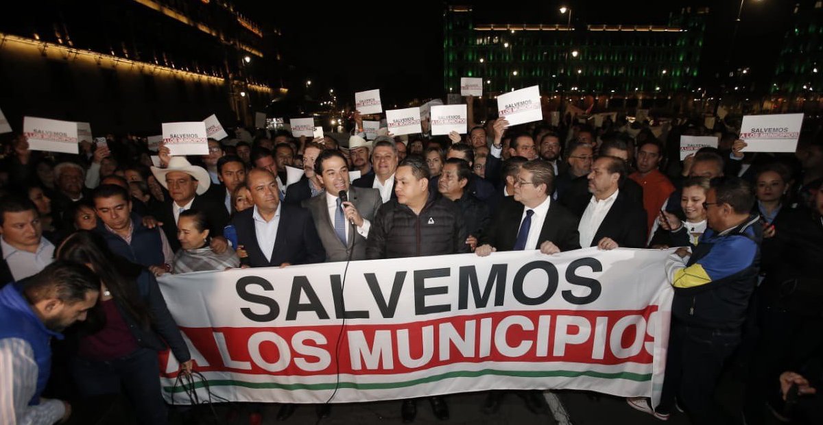 Los mandatarios se encuentra frente a la Puerta Mariana con una manta en la que piden ‘Salvemos a los municipios’, y en espera de una audiencia con las autoridades federales para exponer su problemática.