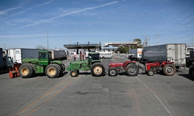 Agricultores y transportistas bloquearon el puente internacional Zaragoza-Ysleta, donde colocaron maquinaria agrícola frente al acceso al cruce internacional para no permitir el flujo de ningún vehículo público o privado. Foto: Christian Torres / EL UNIVERSAL