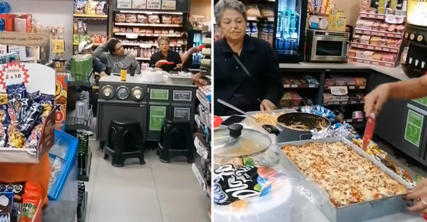 En el material audiovisual se puede ver a una familia sentada alrededor de la barra de café, que acondicionaron como mesa, así como a la trabajadora aparentemente sirviendo la cena.