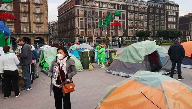 Así como él, varias personas amanecieron en la plancha del Zócalo capitalino, la cual permanece ocupada a la mitad: del asta bandera, hacia su parte norte. Ahí están alrededor de 350 casas de campaña nuevas y de colores diversos, las cuales son de los integrantes del Frente Nacional AntiAMLO (Frenaaa) que tuvieron que recurrir a un amparo para poder llegar al espacio que está frente a Palacio Nacional.