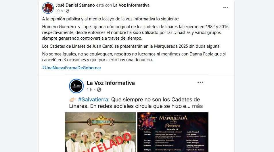 Esa respuesta se dio luego de que, en el perfil de Facebook de La Voz Informativa, hiciera público lo siguiente: “#Salvatierra: Que siempre no son los Cadetes de Linares. En redes sociales circula que se hizo el cambio a los Cadetes de Juan Cantú, para la Marquesada 2025”.