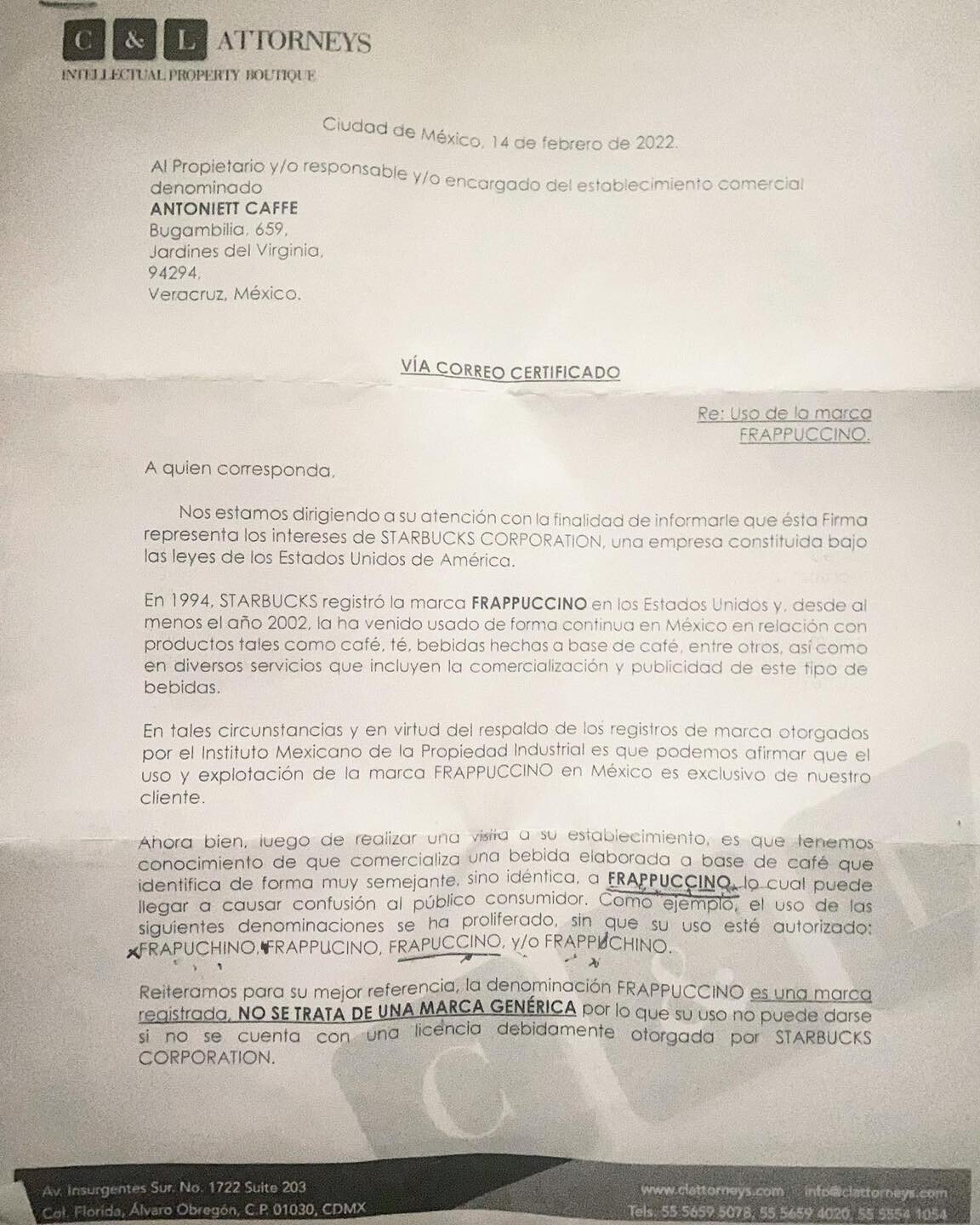 Por lo tanto, solicitan a la cafetería que “desista y retire el uso, venta, promoción a cualquier actividad comercial relacionada con la marca Frappuccino o las variantes Frapuchino, Frappucino, y/o Frappuchino en su establecimiento mercantil” en el establecimiento, menú, carteles, página web, redes sociales y cualquier tipo de publicidad.