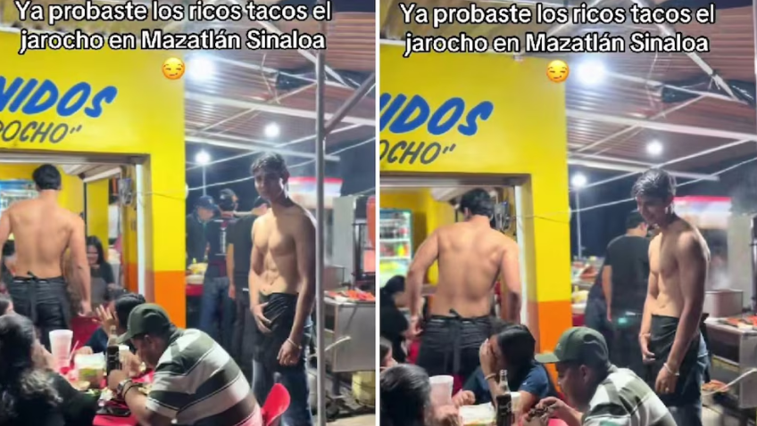 Se trata de una taquería identificada como “El Jarocho”, cuyos videos han acumulado millones de reproducciones en plataformas digitales. En las grabaciones se observa a varios jóvenes que ofrecen el servicio con el torso descubierto, portando únicamente mandil, mientras preparan y sirven tacos a los comensales que se acercan al negocio.