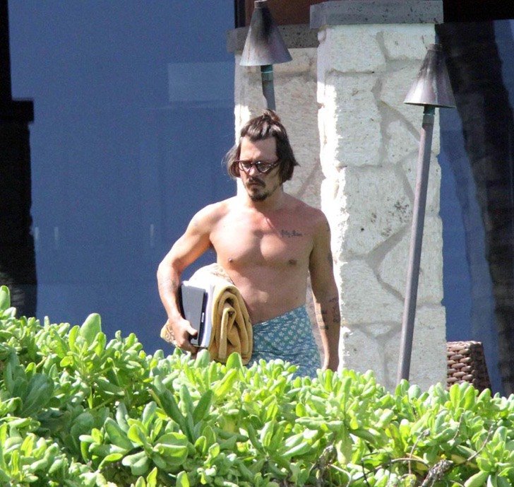 Johnny Depp toma el sol de Hawai. Sacó una toalla con él mientras se preparaba para tomar el sol sin camisa.