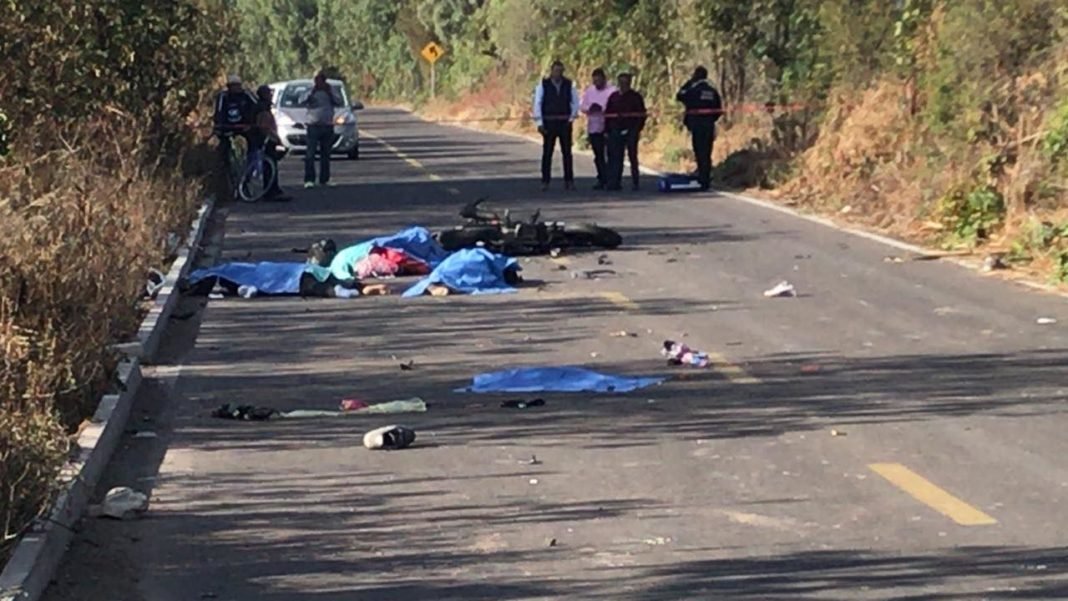 El reporte se dio a la Fiscalía un accidente automovilístico en carretera San Miguel Octopan- Apaseo el Grande, dónde participo una motocicleta y un camión de pasajeros. Al arribar AIC se aprecia 3 personas sin vida, 2 del sexo masculino y 1 del sexo femenino, quienes tenían su domicilio en San Miguel Octopan.