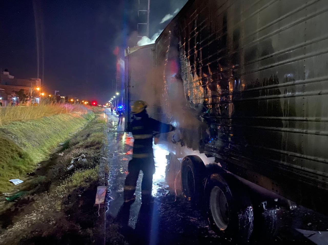 Se trato de un tracto camión que tenía llamas en los ejes traseros de la caja, de la marca Kenworth tipo quinta rueda con la placa 39-AK-IX de la empresa Magdamex con número económico 07 color blanco, sofocando el fuego a la 1:40 horas, se supo que el tráiler cargaba aparentemente bolsas de frijol negro explayado en tarima. La unidad fue levantado y llevada a un corralón, donde serán las autoridades pertinentes quienes investiguen estos hechos. Pie de foto La unidad tuvo daños materiales Bomberos llegaron a la zona para sofocar el incendio.