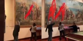 Activistas lanzan pintura roja a obra de arte sobre Cristóbal Colón...