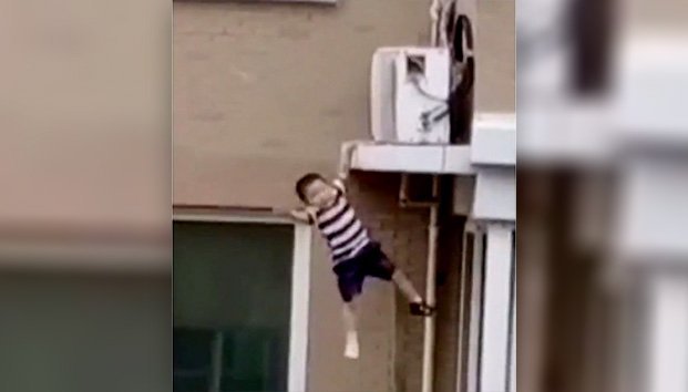 China.- Un video grabado en la provincia de Jiangsu, en el este de China, muestra el espeluznante momento en que un niño de dos años cae desde el quinto piso de un bloque de apartamentos y es atrapado milagrosamente por un vecino.